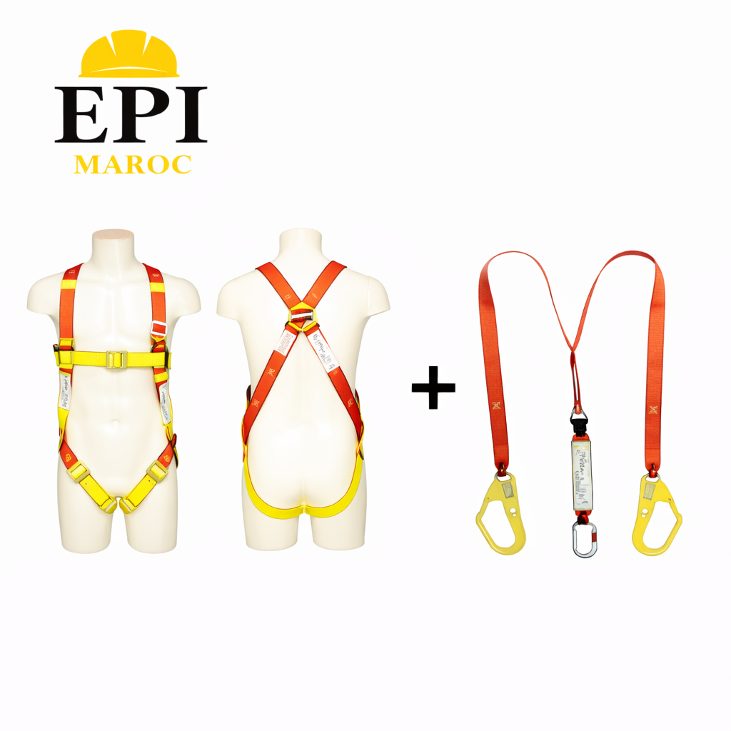 Le harnais complet avec longe à double sangle et amortisseurs, conforme aux normes EN361 et EN354, est un équipement de protection individuelle antichute conçu pour assurer une sécurité maximale lors des travaux en hauteur.